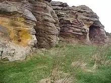 The word 'cove' in Scots means 'cave'.[4] The caves were all constructed by the sea eroding away the sandstone with a selection of the larger caves also being carved by the various groups of humans who have occupied the caves at various points in time.