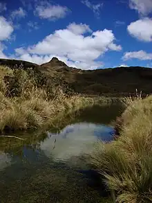 Local habitat types include the grasslands of the páramo and montane cloud forests. Bunchgrasses, ferns, and lycopods are common plants. There are over 100 species of endemic plants.[2]
