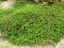 This shrub is generally wider than it is tall and often lies prostrate in a mat on the ground. The younger branches are hairy and somewhat feltlike in texture. The distinctive evergreen leaves are oval to almost rectangular and have a cupped, rippled surface. The edges are toothed with tiny glandular knobs and the shiny surface may be dotted with more knobs. The underside of the leaf is fuzzy to hairy. The inflorescences are borne on short, stout stalks and the tiny flowers are lavender to blue with prominent yellow-anthered blue stamens.