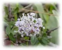 This rare shrub is up to about 3 meters wide and flat, forming low brambles or mats. The grayish brown stems root at nodes as they grow horizontally along the ground. The tiny evergreen leaves are oppositely arranged. Each is only about a centimeter long, widely lance-shaped and smooth along the edges or sometimes toothed near the tip. The top surface is green and hairless and the underside is somewhat woolly. The inflorescence is a small cluster of white to pale blue flowers. The fruit is a capsule about half a centimeter long, sometimes bearing small horns on top.