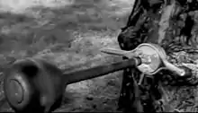 The most widely used version of the spigot gun was the tree spigot gun. This had its spigot mounted on a ball and socket joint attached to a large wood screw. A pair of handles were provided to turn the screw so that it could be secured in a tree or other suitable wooden support; one of the handles had a chisel-shaped end for removing bark from trees. When this had been done, a sighting tool could be placed on the spigot, and the spigot was then adjusted and clamped into position. The sight was then removed and replaced with the mortar projectile.[44][41] The weapon was fired by pulling on a lanyard, by a trip wire as part of a booby trap or by a pencil detonator delay mechanism.[44] The tree spigot had a range of 200 yards (180 m). As part of a booby trap, it could be positioned to fire downwards onto the relatively thin armour on top of a tank.[41] One account of its use describes a trip wire for a locomotive; placed up high it was likely to be missed by track walkers looking for bombs on the railway line.[45][46]