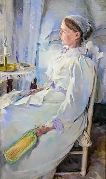 Beaux attended Sartain's classes for two years, then rented her own studio and shared it with a group of women artists who hired a live model and continued without an instructor. After the group disbanded, Beaux set in earnest to prove her artistic abilities. She painted a large canvas in 1884, Les Derniers Jours d'Enfance, a portrait of her sister and nephew whose composition and style revealed a debt to James McNeill Whistler and whose subject matter was akin to Mary Cassatt's mother-and-child paintings.[25] It was awarded a prize for the best painting by a female artist at the Academy, and further exhibited in Philadelphia and New York. Following that seminal painting, she painted over 50 portraits in the next three years with the zeal of a committed professional artist. Her invitation to serve as a juror on the hanging committee of the Academy confirmed her acceptance amongst her peers.[26] In the mid-1880s, she was receiving commissions from notable Philadelphians and earning $500 per portrait, comparable to what Eakins commanded.[27] When her friend Margaret Bush-Brown insisted that Les Derniers was good enough to be exhibited at the famed Paris Salon, Beaux relented and sent the painting abroad in the care of her friend, who managed to get the painting into the exhibition.[27]