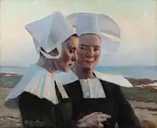 When Beaux arrived in Paris, the Impressionists, a group of artists who had begun their own series of independent exhibitions from the official Salon in 1874, were beginning to lose their solidarity. Also known as the "Independents" or "Intransigents", the group which at times included Degas, Monet, Sisley, Caillebotte, Pissarro, Renoir, and Berthe Morisot, had been receiving the wrath of the critics for several years. Their art, though varying in style and technique, was the antithesis of the type of Academic art in which Beaux was trained and of which her teacher William-Adolphe Bouguereau was a leading master. In the summer of 1888, with classes in summer recess, Beaux worked in the fishing village of Concarneau with the American painters Alexander Harrison and Charles Lazar. She tried applying the plein-air painting techniques used by the Impressionists to her own landscapes and portraiture, with little success.[32] Unlike her predecessor Mary Cassatt, who had arrived near the beginning of the Impressionist movement 15 years earlier and who had absorbed it, Beaux's artistic temperament, precise and true to observation, would not align with Impressionism and she remained a realist painter for the rest of her career, even as Cézanne, Matisse, Gauguin, and Picasso were beginning to take art into new directions.[33] Beaux mostly admired classic artists like Titian and Rembrandt. Her European training did influence her palette, however, and she adopted more white and paler coloration in her oil painting, particularly in depicting female subjects, an approach favored by Sargent as well.[34]