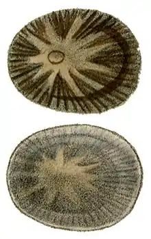 | Drawing of the shell of Cellana stellifera. Dorsal (apical) view and ventral (apertural) view. Head region is on the left. | |