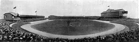 Before the First World War, Celtic Park was a multi-event venue.[1] It hosted the first ever composite rules shinty-hurling match in Scotland, in 1897.[77] Track and field meetings were held every summer, while the only World Cycling Championship to be staged in Scotland was held at Celtic Park in 1897.[1][78] An experimental floodlit football game was played on Christmas Day 1893.[1] This was unsuccessful due to the ball repeatedly striking the lamps, which were hung over the pitch by wiring.[1] Rugby league football was first played in Scotland at Celtic Park, when it hosted a game between a Northern Rugby Football Union representative side and the touring Australian team in 1909.[79] Open-air Masses and a parade for the Coronation of King George V were staged.[1] Celtic Park, along with many other football stadiums, hosted recruitment drives during the First World War.[80] During one such event at Celtic Park, a demonstration of trench warfare was carried out.[1][80] The first pukka speedway race meeting in Scotland was held at Celtic Park on 28 April 1928. It staged 12 meetings in all before closing in July 1928[1] (although some of the events may have been staged at the neighbouring Nelson Recreation Ground).[81]