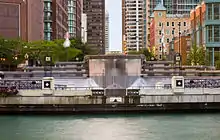Nicholas J Melas Centennial Fountain is located on the north bank of the Chicago River at McClurg Court in Near North Side, Chicago.[1] It was dedicated in 1989, to celebrate the 100th anniversary of the Metropolitan Water Reclamation District of Greater Chicago, perhaps best known for its major achievement in reversing the flow of the Chicago River in 1900;[2] and in 1999, this system was named a "Civil Engineering Monument of the Millennium" by the American Society of Civil Engineers (ASCE).[3]