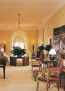 In the early 20th century, William Howard Taft decorated the hall with exotic plants and art he had brought with him from his tenure as Governor-General of the Philippines. Later, Woodrow Wilson watched motion pictures here as the present White House theater was still a cloakroom.