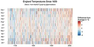 - ↑ @iamreddave (16 June 2016). "England Temperatures Since 1659". Archived from the original on 7 September 2019. Retrieved 7 September 2019. ● Data source: Met Office U.K., Hadley Centre (archive).