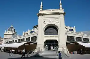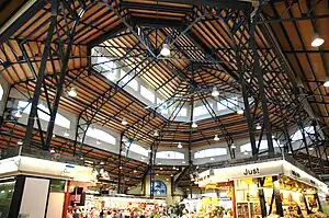 The Central Market of Sabadell (Catalonia, Spain) is a large building designed between 1927 and 1930 by local architect Josep Renom i Costa, spanning both the "monumentalism" typical of the construction craze at the end of Miguel Primo de Rivera's dictatorship and the beginning of the Second Spanish Republic. In 2004 it underwent renovation work.[1] It was devised at the time as a specially fine model for municipal structures of this sort. On the sides is inscribed the Catalan word for "market", mercat. Its floor is an irregular quadrilateral, and its basement included originally an ice factory which, however, was closed at the onset of the Republic because the former government didn't pay for its costs.[2]