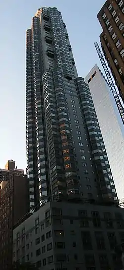 Central Park Place is 628 feet (191 m) tall with 56 stories.[4][5] It was designed by Davis, Brody & Associates, with Rosenwasser/Grossman Consulting Engineers as structural engineer.[5] The tower was built by HRH Construction.[6] The lowest six stories occupy the whole lot, while the upper stories are smaller.[7]