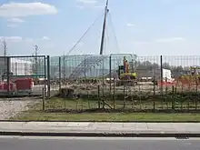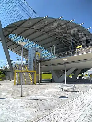 The station building features a striking curved copper and glass canopy suspended by a cable-tensioned steel structure.[4] It was designed by architects Aukett Fitzroy Robinson,[5] whose work has included a number of projects for London Underground (including Clapham Common tube station, and the reconstruction of Farringdon and Blackfriars stations). It was completed in 2005 in readiness for the Metrolink extension through Oldham to Rochdale as part of Phase 3a of the Metrolink expansion project.[3] However, due to funding problems and repeated project cancellations, the line extension remained unused for seven years.[2] Although the station lies next to the Calder Valley railway line between Victoria and Rochdale (at the northern end of the old "Cheetham Hill Loop" line built by the L&YR in 1877 to avoid the notorious Miles Platting bank, which closed in 1998), there is no interchange with National Rail services. However, it is possible that railway platforms may be added in future.[6]