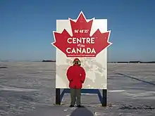 There is a sign on the Trans-Canada Highway at 96°48'35"W (slightly east of Winnipeg) proclaiming it the longitudinal centre of Canada;[1] in effect, the north-south line midway between the extreme points of Canada on the east and west, including islands (including Newfoundland since 1949).