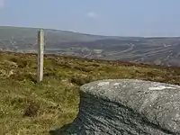 This stake is one of several way markers that mark the location of variously calculated geographic centres of Britain. It is located just to the west of Whitendale Hanging Stones in Lancashire at SD 64188 56541.