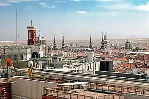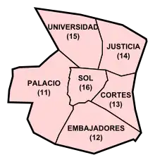 Centro ([ˈθentɾo], "Centre") is a district of Madrid, Spain. It is approximately 5.23 km2 (2.02 sq mi) in size. It has a population of 149,718 people and a population density of 28,587/km2 (74,040/sq mi). It roughly corresponds to the bulk of the housing formerly enclosed by the so-called Walls of Philip IV.[1] The district is made up of the neighbourhoods of Cortes, Embajadores, Justicia, Universidad, Palacio and Sol.