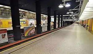 Centrum is a station on Line M1 of the Warsaw Metro, located under Plac Defilad, a square in the borough of Śródmieście, next to the Dmowski roundabout, where the two main streets, Marszałkowska and Aleje Jerozolimskie, intersect. It is located close to the Palace of Culture and Science and connections can be made, via Pasaż Wisławy Szymborskiej and Aleje Jerozolimskie at ground level, to Warszawa Śródmieście railway station which is in turn directly connected to Warszawa Centralna railway station. It has two levels: the lower one contains the platforms and the upper one is a shopping mall.