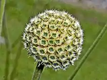 | Inflorescence of Cephalaria alpina at the Paradisia Alpine Botanical Garden | |