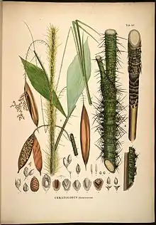Ceratolobus was a dioecious genus of flowering plants in the palm family found in Southeast Asia, commonly called rotan. Its species are now included within the genus Calamus.[2] They are only differentiated from close relatives like Korthalsia, Calamus, and Daemonorops by leaf sheath appendages or inflorescence variations.[3] The Greek genus name combines "horn" and "capsule".[4]