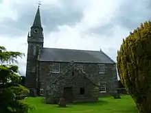 The current parish church was built in 1806 to a design by Alexander Leslie, replacing a medieval building. A tower and octagonal spire were added in the 1850s. Apart from the addition of electric lighting and two early 20th-century stained glass windows (either side of the central pulpit), the interior is substantially unaltered from when first built and retains the gallery and original wooden box pews.[8]