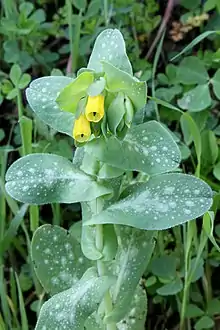 Cerinthe major, called honeywort along with other members of its genus, is an annual species of flowering plant in the genus Cerinthe, native to the Mediterranean region (southern Europe, western Asia and northern Africa), and introduced to New Zealand.[2] Gardeners have a choice along a spectrum of cultivars ranging from Cerinthe major subsp. major, with sea-green bracts and yellow flowers, to Cerinthe major subsp. purpurascens with blue bracts and purple flowers.[3]