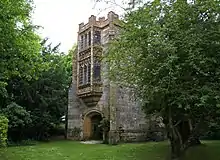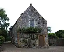 Following Dissolution of the Monasteries, the buildings were mainly demolished. Abbey House, a Grade I listed building, occupies the site of the gatehouse and incorporates parts of it. Most of the house dates from after a fire in the middle of the 18th century in which the gatehouse was seriously damaged.[4] The late 15th-century Guest House of the abbey is also Grade I listed,[5] as is the very elaborate stone vaulted porch of the abbot's hall, built around 1500, which survives in the midst of a wooded lawn,[6] with a Grade II* listed, early 16th century barn lying to its north.[7] A Grade I listed, 14th-century tithe barn, converted to a house in the late 18th century, lies to its east.[8]