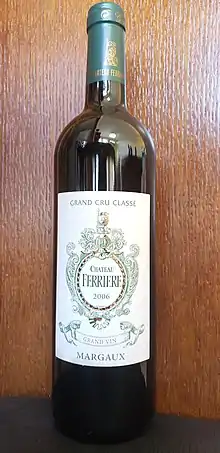 Château Ferrière is a winery in the Margaux appellation of the Bordeaux region of France. The wine produced here was classified as one of fourteen Troisièmes Crus (Third Growths) in the historic Bordeaux Wine Official Classification of 1855.[1] The Château has 29 acres (12 ha) planted with Cabernet Sauvignon, Merlot and Cabernet Franc.[2]