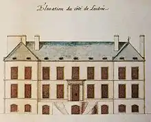 Completed in 1726, it was built in the classical style of the French Hôtel Particulier by King Louis XV's chief engineer in New France, Gaspard-Joseph Chaussegros de Léry. The central building was flanked by two wings with two sets of semi-circular stairs leading up to a terrace and the main entrance. It stood beyond the end of Rue Saint-Paul, which was kept clear of buildings on that side to afford it a clear view, while formal gardens led up to Notre-Dame Street.[2]