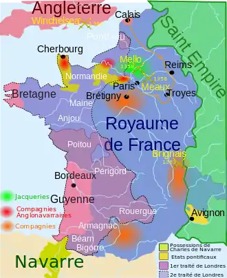 Following the imprisonment of Charles II of Navarre in 1356, the Duke of Lancaster was sent by the King of England to rescue Philip of Navarre, brother of Charles. His army of twelve hundred horsemen, sixteen thousand archers and two thousand armed brigandines convened in Évreux.