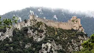 The Château de Puilaurens (Puilaurens Castle, also Puylaurens; in Occitan: lo Castèl de Puèg-Laurenç) is one of the so-called Cathar castles in the commune of Lapradelle-Puilaurens in the Aude département.[1] The castle is located above the Boulzane Valley and the villages of Lapradelle and Puilaurens. There is a path from Axat to the castle.