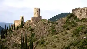The Châteaux de Lastours (in Occitan Lastors) are four so-called Cathar castles in the French commune of Lastours in the département of l'Aude. The four castles are on a rocky spur above the village of Lastours, isolated by the deep valleys of the Orbeil and Grésilhou rivers. They were built at an altitude of 300 m along a rock wall just 1,300 ft (400 m) long by 165 ft (50 m) wide. Cabaret, Surdespine and la Tour Régine stand in line, while Quertinheux is built on a separate pinnacle close by. The site has been classified monument historique (historic monument) by the French Ministry of Culture since 1905 and archaeological digs are still in progress.[1]