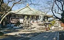 A little above the Taishaku-dō stands the Hokke-dō, a small building which is the temple's de facto main hall.[3] The building, originally built during the Muromachi period, is an Important Cultural Property.[3] It contains three more Important Cultural Properties, a gong (waniguchi), a lacquered dining table (kakeban), and a candle stand (shokudai).[3]