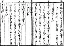 The work was published in 10 fascicles in 1676, when it was adopted as the official textbook for teaching Japanese, replacing 14 out-dated titles.[4] The Japanese text is written in large hiragana, with a phonetic transcription in Hangul on the right and followed by a translation in Korean mixed script.[4] A copy of this edition is held by the Seoul National University Library.[5] The book and its revisions remained the sole official Japanese text for the following two centuries.[4]