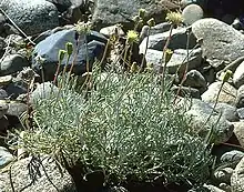 Chaenactis suffrutescens is a spreading subshrub producing several branching erect stems reaching up to about 50 cm (20 inches) tall. The leaves are several centimeters long and divided into several lobes which are subdivided into smaller lobes. The leaves are coated in feltlike white woolly fibers.[4]