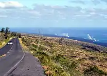 Toward the sea the road crosses a pāhoehoe lava flow. In the early 2000s, steam from lava tubes could be seen.[5]