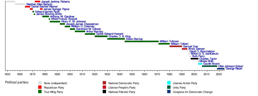 George WeahEllen Johnson SirleafGyude BryantMoses BlahCharles TaylorRuth PerryWilton G. S. SankawuloDavid D. KpormakporAmos SawyerSamuel DoeWilliam TolbertWilliam TubmanEdwin BarclayCharles D. B. KingDaniel Edward HowardArthur BarclayGarretson W. GibsonWilliam D. ColemanJoseph James CheesemanHilary R. W. JohnsonAlfred Francis RussellAnthony W. GardinerJames Skivring SmithEdward James RoyeJames Spriggs PayneDaniel Bashiel WarnerStephen Allen BensonJoseph Jenkins Roberts