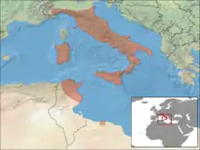The Italian three-toed skink is native to Italy, where it is common south of the River Po, and including Sardinia, Elba and Sicily, and North Africa, where its range includes Morocco, Algeria, Tunisia and Libya. Its typical habitat is damp but sunny areas with dense low vegetation such as meadows, stream verges, marshes, grassy slopes and hedgerows. In upland areas it may inhabit drier, more arid areas with low scrub and degraded slopes.[2] Its altitudinal range is from sea level to 2,077 m (6,814 ft).[3]