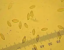 The spores are smooth, narrowly fusiform (fuse-shaped), and measure 7–12 by 3–5 µm. The basidia (spore-bearing cells) measure 20–28 by 6–8 µm and are hyaline (translucent), four-spored, and narrowly club-shaped, with many internal oil droplets. Cystidia are fusiform, sometimes with a rounded tip, and have dimensions of 30–50 by 9–12 µm. Some are more or less hyaline, while others are encrusted with a golden pigment.[17] The cap cuticle is a trichodermium, an arrangement in which the outermost hyphae emerge roughly parallel, like hairs, perpendicular to the cap surface. These hyphae are 10–17 µm wide and have elliptical to cylindrical cells at their ends that are not gelatinous. Clamp connections are absent from the hyphae.[18]