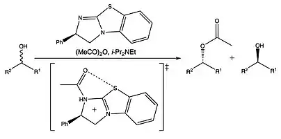Chalcogen bonding in catalysis has been used to pre-orient substrate, allowing for asymmetric/stereoselective catalysis on the preferred conformation of the substrate. Examples include an asymmetric acyl transfer on an enantiomeric mixture catalyzed by a chiral isothiourea. The acyl group is first transfer on to the chiral catalyst which is purported to go through a transition state featuring a 1,5 chalcogen bonding interaction on the catalyst which orients the acyl group prior to transfer on to the substrate. This resulted in one enantiomer of the substrate acylated and the remaining substrate enriched in the other enantiomer.[15] Similar interactions have been invoked in stereoselective Michael additions and β-lactonizations.[16]