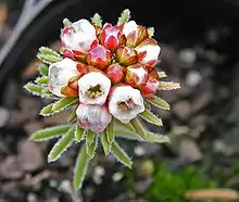 The erect shrub typically grows to a height of 0.15 to 1 metre (0 to 3 ft) but can reach as high as 2 metres (7 ft). It blooms between August and January producing white-pink flowers.[1]