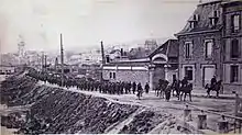 In January 1911, frustrations reached boiling point as riots erupted along the towns of Damery and Hautvilliers. Champenois vine growers intercepted trucks with grapes from the Loire Valley and pushed them into the Marne river. They then descended upon the warehouses of producers known to produce these faux Champagne, tossing more wine and barrels into the Marne. The owner of Achille Perrier found his house surrounded by an angry mob chanting "A bas les fraudeurs" (Down with cheaters). He was able to escape harm by hiding in the home of his concierge. The height of the violence was experienced in the village of Aÿ, located 3 miles (4.8 km) northeast of Épernay.[4] [5][6] As the mob descended upon the city little was spared. Homes of private citizens as well as Champagne house producers were pillaged and ransacked. Somewhere a fire was started that spread throughout the city. The regional governor sent an urgent telegraph to Paris requesting assistance stating, "We are in a state of civil war!" By sunrise the entire village of Aÿ was burning.[4] To quell the violence, the French government sent over 40,000 troops to the region—setting up a billet in every village.[3]