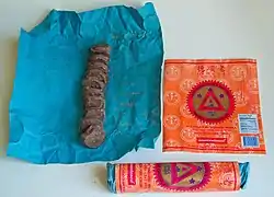 ![]() ![]() Top: A bowl of champorado with milk; Bottom: Tabliya, locally made tablets of pure chocolate made from fermented, toasted, and ground cocoa beans | |||||||