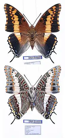 Charaxes saturnus[stat.rev.2005][4] is a medium to large butterfly, with forewing length of 40–44 mm in the male, and 46–50 mm in the female.[5] The background colour of all four wings is a very dark blackish brown, with a broad orange postdiscal band traversing both pairs of wings from the leading edge of the forewings almost to the anal margin of the hindwings. The forewing outer margins are orange traversed by black-scaled veins. The hindwing has six orange marginal lunules, the lower three are white-edged to completely white. There are typically three or four blue submarginal spots towards the anal angle. The body and the basal area of all four wings is a tawny orange-brown.[5][6] The underside exhibits a very characteristic mosaic appearance broadly similar to a number of closely related species, traversed by a jumble of bands, and of reddish, brown, and greyish patches, all edged with a filigree of white. Beyond the inner mosaic, a white complete postdiscal band bridges across fore- to hindwings. The outer orange marginal coloration is present on the underside as narrow white-edged lunules, bounded by a grey submarginal band. The female resembles the male but is larger. Both sexes of Charaxes saturnus are similar to females of Charaxes achaemenes. and Charaxes guderiana.