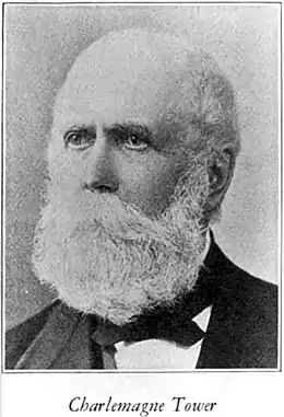 Charlemagne Tower (April 18, 1809 – July 25, 1889[1]) was an American lawyer and businessman active in acquiring land in the Schuylkill Valley in Pennsylvania and serving as an officer for coal and railroad companies. He organized and led a company of Union soldiers from Pottsville in a 3-month enlistment during the American Civil War, when he was commissioned as captain.