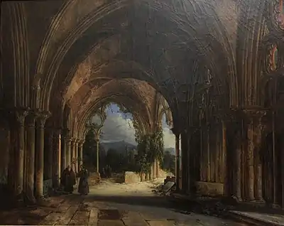 The romanticism of this painter does not turn to gloomy subjects or to the very intellectual pessimism then cultivated by so many poets. He keeps the alert frankness of an artist who finds in the spectacle of architecture and nature a sincere pleasure.…Few paintings combine so delicately the majesty of Gothic art, the melancholy of ruins and the serenity of a retreat preserved in the heart of nature.[26]