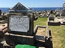 Messenger's grave in Waverley Cemetery stating that he died on 21 April 1905 aged 52 years