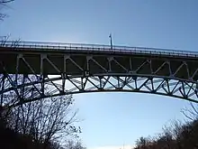 The Charles Anderson Memorial Bridge is a steel deck truss bridge located in Pittsburgh, Pennsylvania, United States. The bridge carries the four-lane roadway of Boulevard of the Allies across a ravine known as Junction Hollow, connecting the neighborhoods of Central Oakland and South Oakland with Schenley Park.[6] The bridge also spans the Junction Hollow Trail and P&W Subdivision railroad tracks which run along the bottom of the valley.