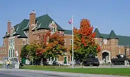 | Salaberry Armoury 188 Alexandre Taché Blvd | 1938 (completed) Charles D. Sutherland | Canada's Register of Historic Places; Recognized – 1993 Register of the Government of Canada Heritage Buildings | Gatineau, Quebec | centrally located Romanesque Revival building with a steeply pitched gable roof houses Régiment de Hull | ![]() |
