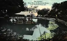 In Montecito, Eaton—a lifelong amateur gardener—developed into a landscape architect and horticulturalist, and the house he built for his family, Riso Rivo, featured a lotus pond with a floating Japanese teahouse that gained him national attention.[1][5][6] He planted an enormous variety of both native and non-native trees at Riso Rivo, including live oak, camphor, cinnamon, avocado, Abyssinian banana, candlenut, and many species of citrus and palms.[1] Eaton was an early champion of planting trees with strong vertical lines like palms and cypresses to complement the dominant horizontal lines of sky, water, and shore along the California coast.[1] Gustav Stickley, one of the American Arts and Crafts movement's most celebrated designers, praised Eaton's landscape work for its revolt "against the formality, the severe training and repression of Nature which constitute the first principles of the French and Italian systems of landscape gardening".[1]