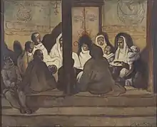 His works are in numerous collections including several lithographs from Ruhleben, now in the Australian War Memorial collection.[8][11] His 1929 oil painting, Music for Ganesha (or Hymne a Ganesha), is in the National Museum Wales,[12] to whom it was donated by Evan Morgan, 2nd Viscount Tredegar in 1930.[13] Buffaloes and Woman Bathing (1932, lithograph) is in the Fitzwilliam Museum, Cambridge.[5] His portrait in oils of Sir Horace Edmund Avory is owned by Corpus Christi College, University of Cambridge.[14]