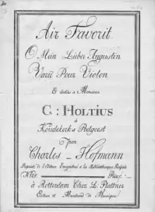 One of Hofmann's compositions is the preserved arrangement of the Viennese song "O Mein lieber Augustin", of which the Dutch later would use the melody for the feast of Saint Nicholas. Hofmann's composition 'Air favorit O mein lieber Augustin, varié pour violon ...' concerns eight lively variations for violin, and was published by Plattner in Rotterdam in 1809. This composition was dedicated to the young gentleman Gualtherus Holtius of the village of Koudekerk aan den Rijn. In 1997 the work was discovered at the Netherlands Music Institute, where it had been preserved.[3]