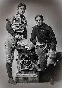 At Yale, Ives was a prominent figure; he was a member of HeBoule, Delta Kappa Epsilon (Phi chapter) and Wolf's Head Society, and sat as chairman of the Ivy Committee.[16] He enjoyed sports at Yale and played on the varsity American football team. Michael C. Murphy, his coach, once remarked that it was a "crying shame" that he spent so much time at music as otherwise he could have been a champion sprinter.[17] His works Calcium Light Night and Yale-Princeton Football Game show the influence of college and sports on Ives's composition. He wrote his Symphony No. 1 as his senior thesis under Parker's supervision.[16]